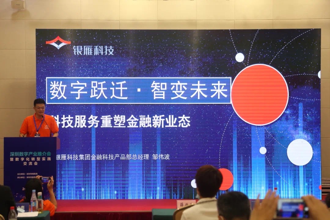 展會期間,銀雁科技金融科技產品部總經理鄒偉波出席深圳數字產業推介會暨數字化轉型實踐交流會,圍繞“數字躍遷,智變未來——科技服務重塑金融新業態”為主題發表演講。鄒偉波提到,在云計算、大數據和人工智能等新興技術快速發展、數字經濟相關政策陸續出臺的背景支撐下,數字化轉型已成大勢所趨,企業只有進行數字化轉型才能提升市場競爭力。