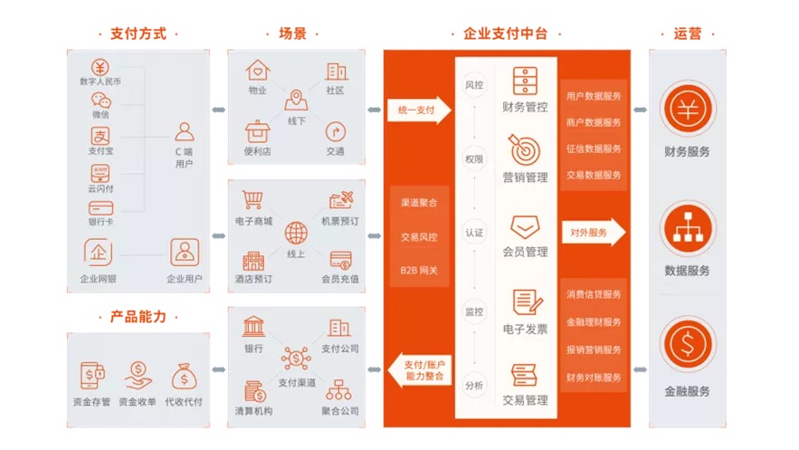 同時,他也指出數字化轉型過程中會面臨諸多挑戰,“信息孤島”是其中亟需解決的問題之一。銀雁科技企業支付中臺以支付為抓手,打通企業經營“脈絡”,實現資金流與業務流、信息流的融合,為企業各業態提供統一標準的賬戶能力、聚合收銀能力及清分結算能力,構建統一的支付生態。