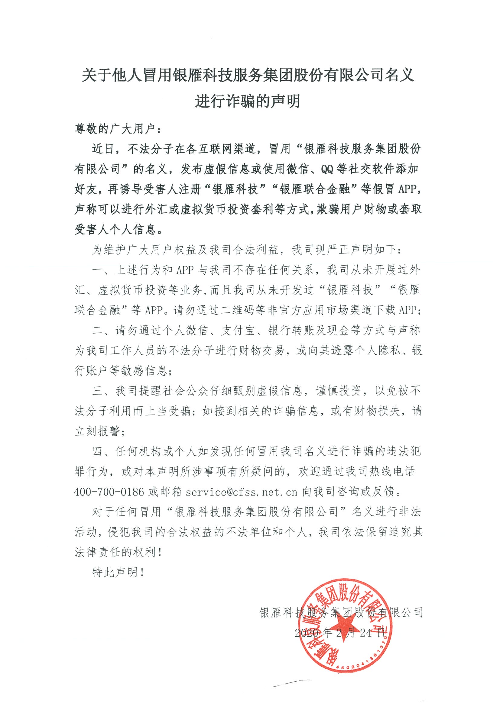 對于任何冒用“銀雁科技服務集團股份有限公司”名義進行非法活動,侵犯我司的合法權益的不法單位和個人,我司依法保留追究其法律責任的權利!